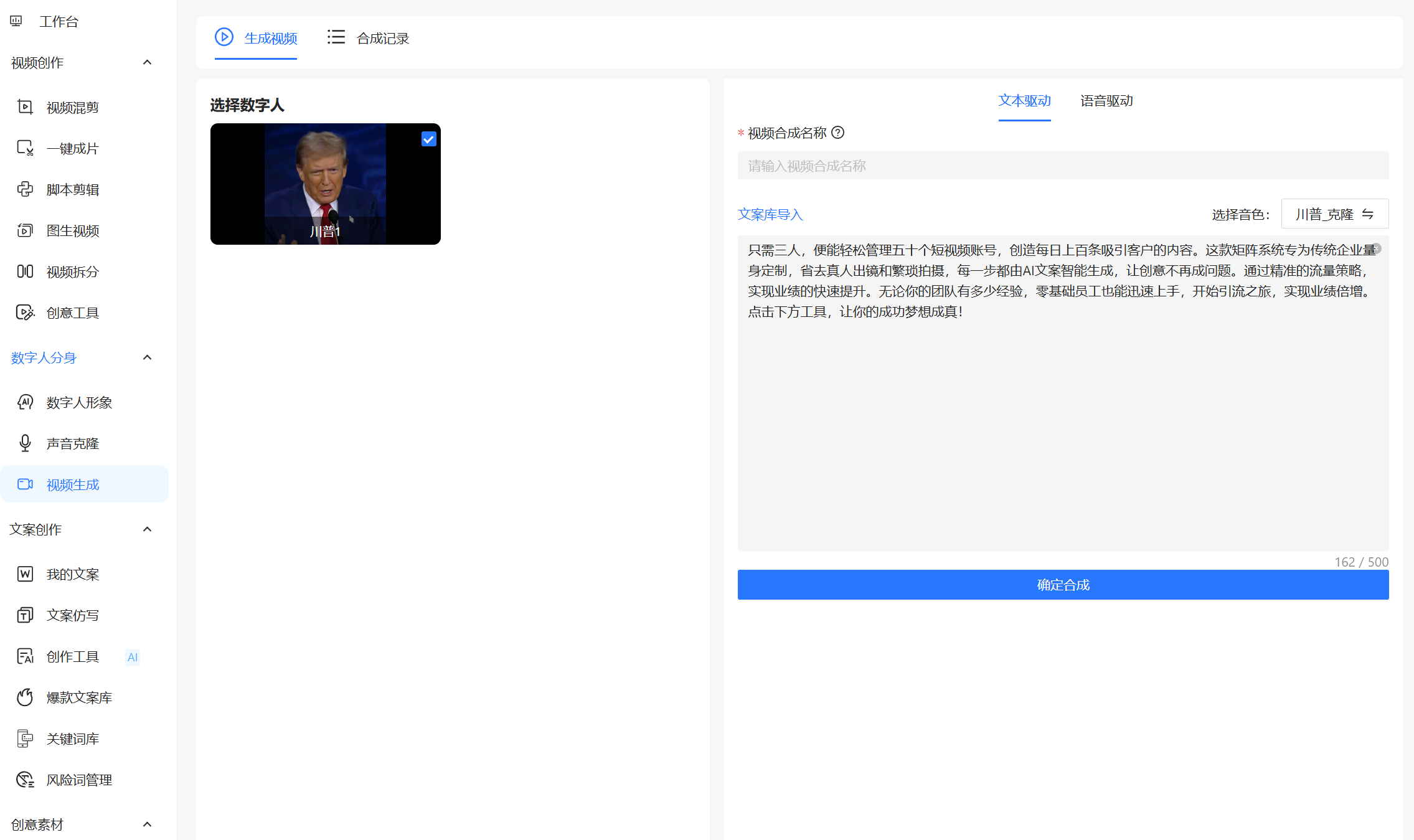 任意上传一段随意说话视频,即可生成匹配特定音色和文案的高质量短视频